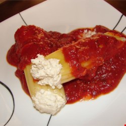 Hearty tubes of cooked manicotti are stuffed with an opulent blend of ricotta, mozzarella and Monterey Jack cheese, sour cream, bread crumbs and parsley. Bake the stuffed pasta blanketed with spaghetti sauce and topped with mozzarella cheese.